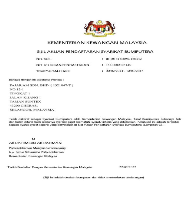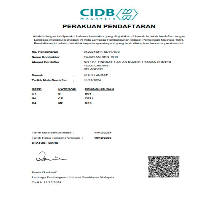 Fajar Am Sdn. Bhd, ditubuhkan pada tahun 2016, adalah syarikat pembinaan